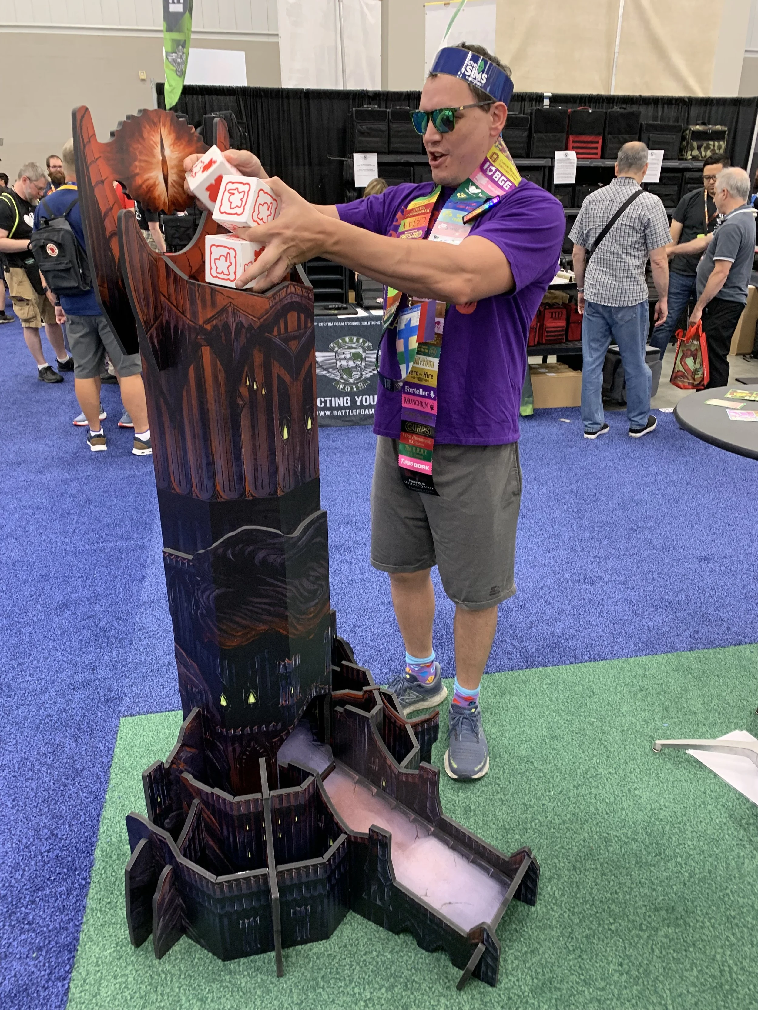 We created a giant replica of the dice tower that comes with The Lord of the Rings: Fate of the Fellowship. This was part of an activation where convention attendees would ‘battle’ against Sauron’s evil force by rolling the oversized dice to win a variety of prizes based on the results. The prizes were buttons of the 13 playable characters and buttons of Hope or Despair.