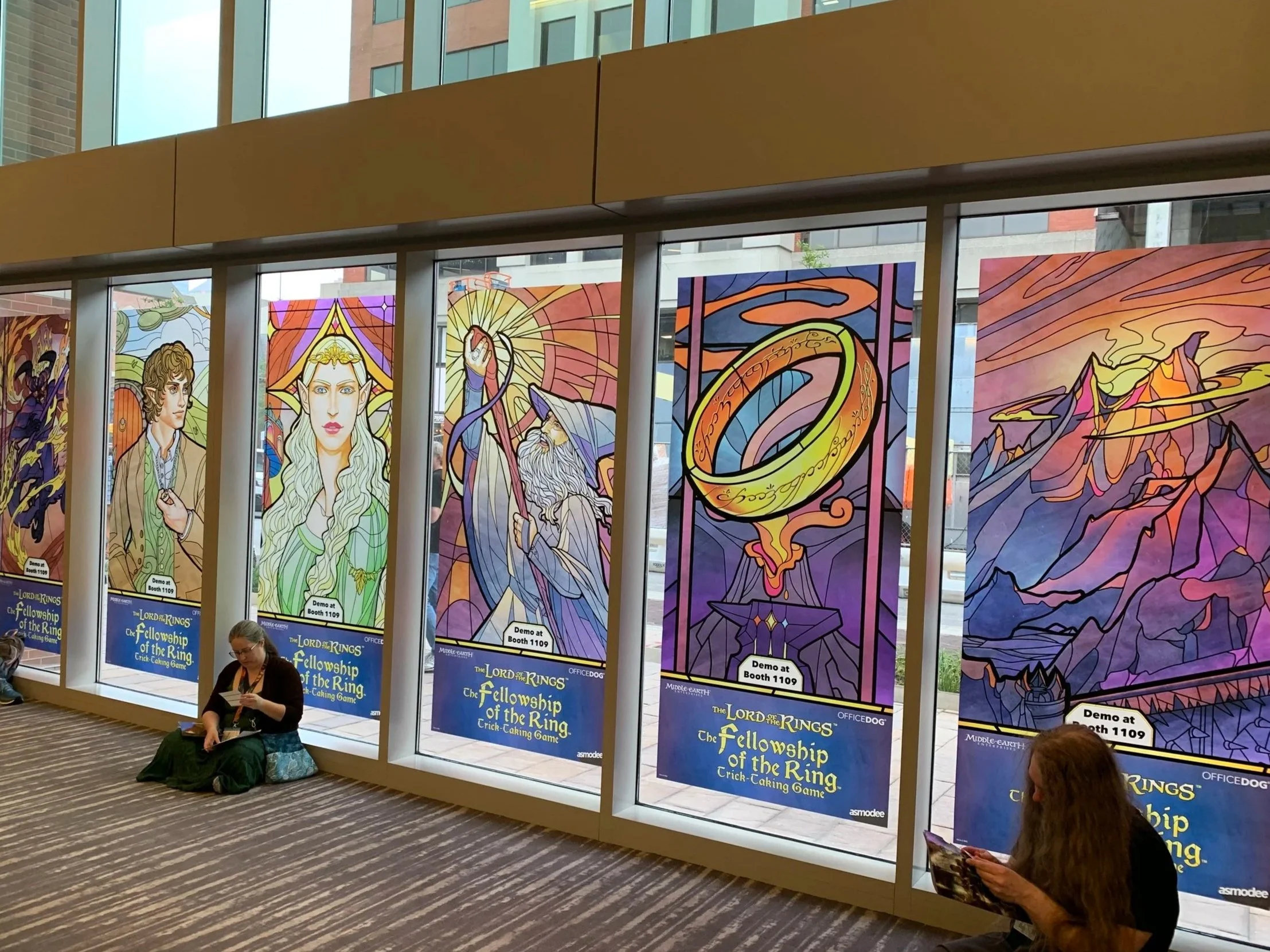 To showcase the beautiful stained-glass art from The Lord of the Rings: The Fellowship of the Ring we wanted to do window clings to really recreate the look of actual stained-glass. These made their debut at Gen Con.