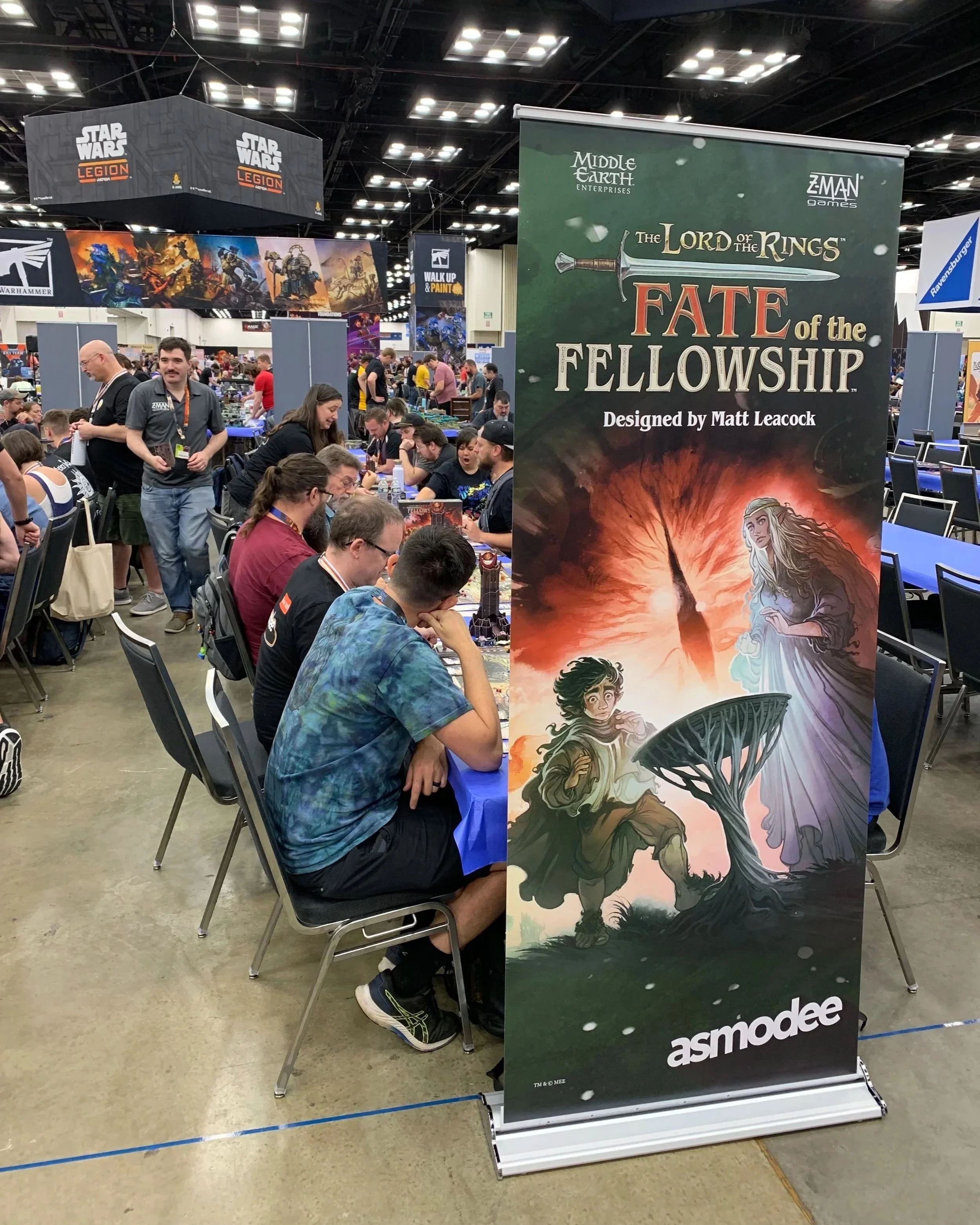 We love showing off our games! For conventions I create banners for the various events and booth needs. Sizes range from small and narrow to HUGE like the Fate of the Fellowship on for Essen below, featuring our lovely game designer Charlie.